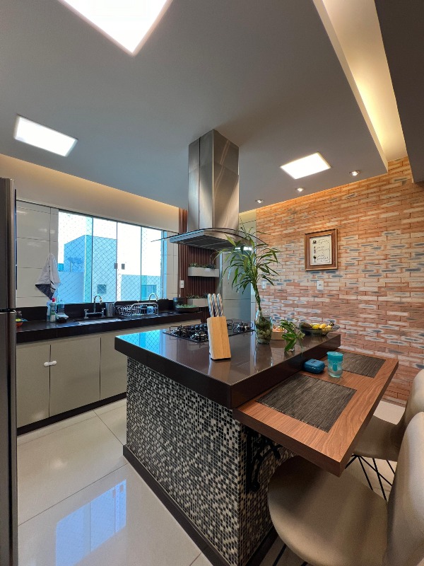 Sala de estar integrada à sala de jantar e cozinha planejada com ilha ;